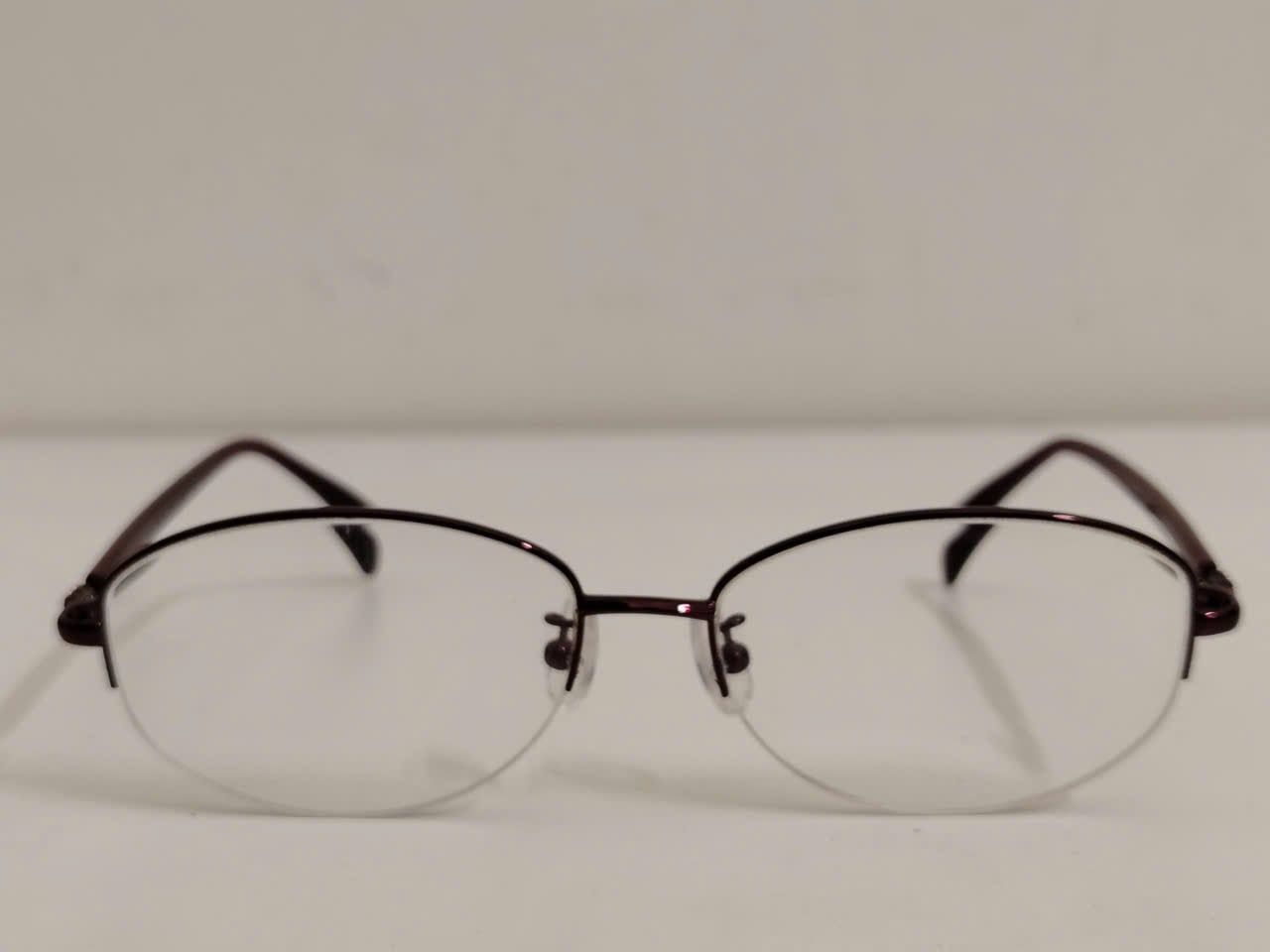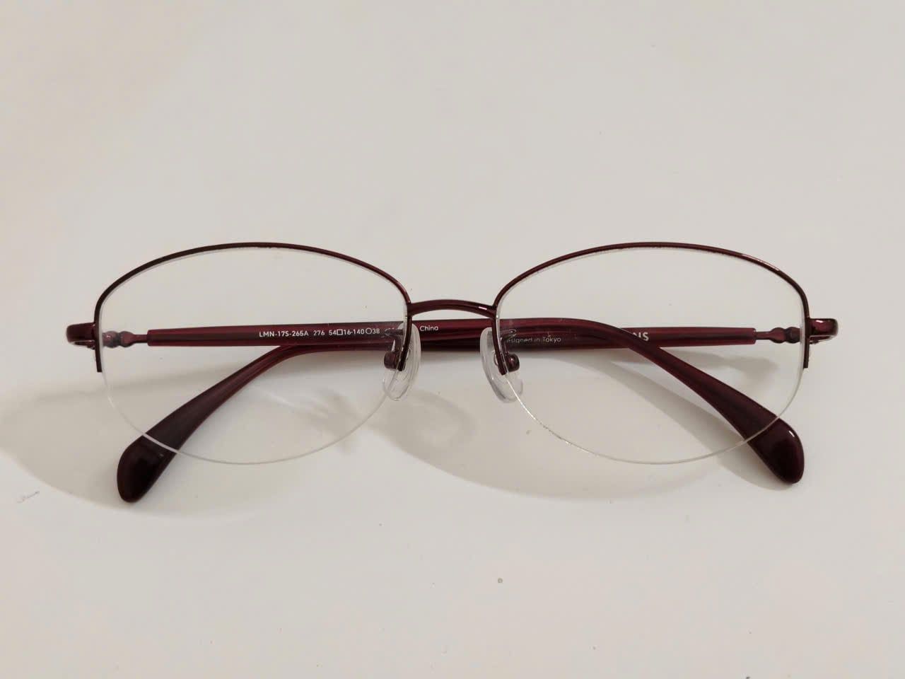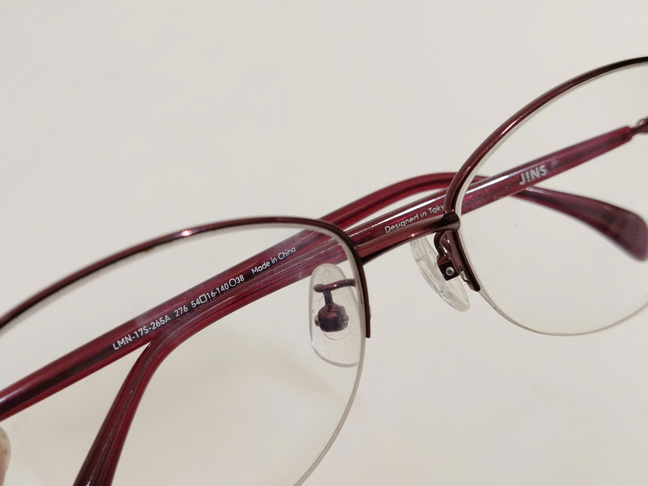 Gọng kính nữa dáng nửa viền màu đỏ tía có gắn đá lấp lánh thương hiệu Jins.